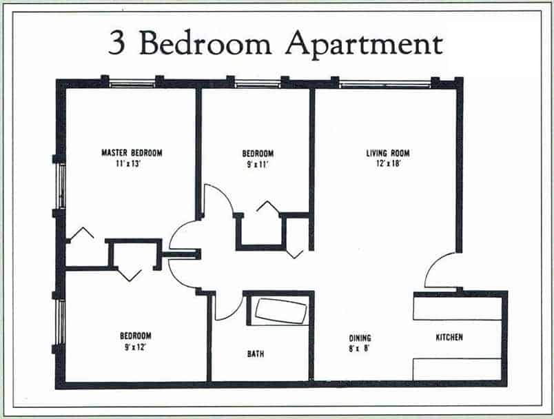 This is the floor plan for the 3 bedroom, 1 bath apartments at Cortland Park.